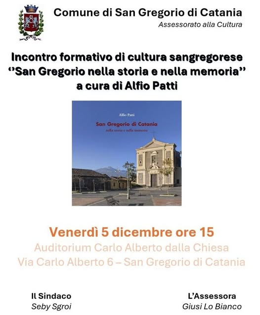 L’Amministrazione Comunale è lieta di invitare la cittadinanza all’incontro formativo “San Gregorio nella storia e nella memoria”, a cura dello scrittore, giornalista e storico Alfio Patti, che si terrà venerdì 5 dicembre alle ore 15.00 presso l’Auditorium Carlo Alberto Dalla Chiesa, in via Carlo Alberto 2.
