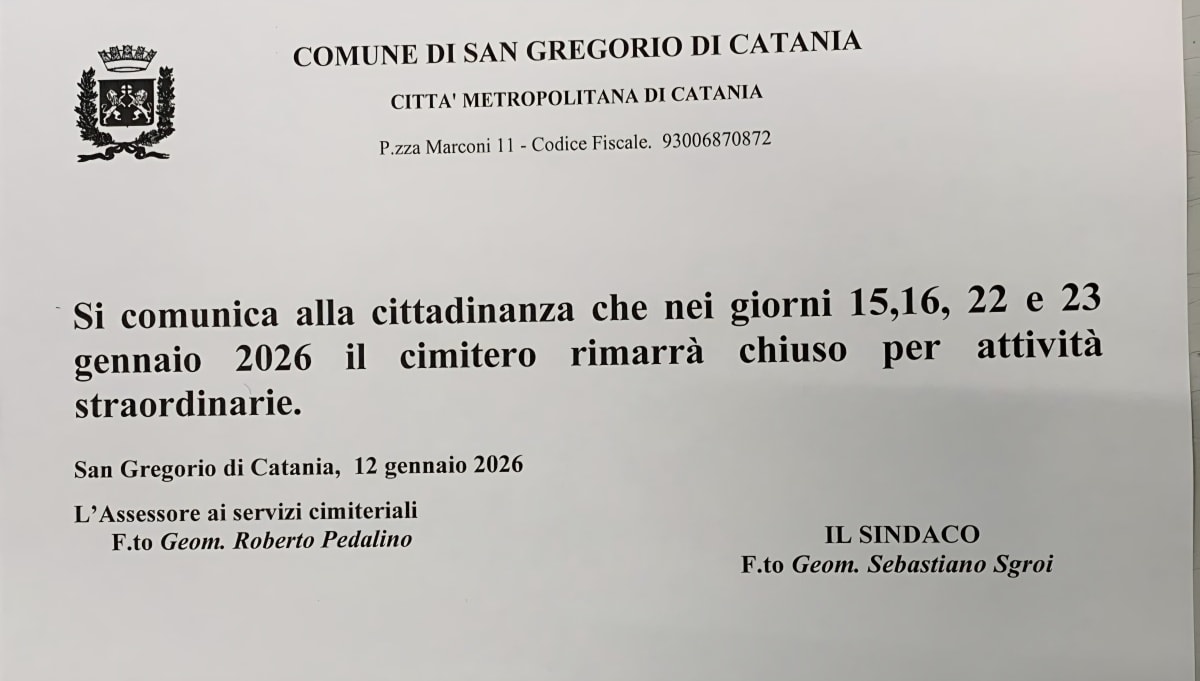 Avviso chiusura straordinaria cimitero comunale giovedi 15, venerdì 16, giovedì 22 e venerdì 23 gennaio 2026