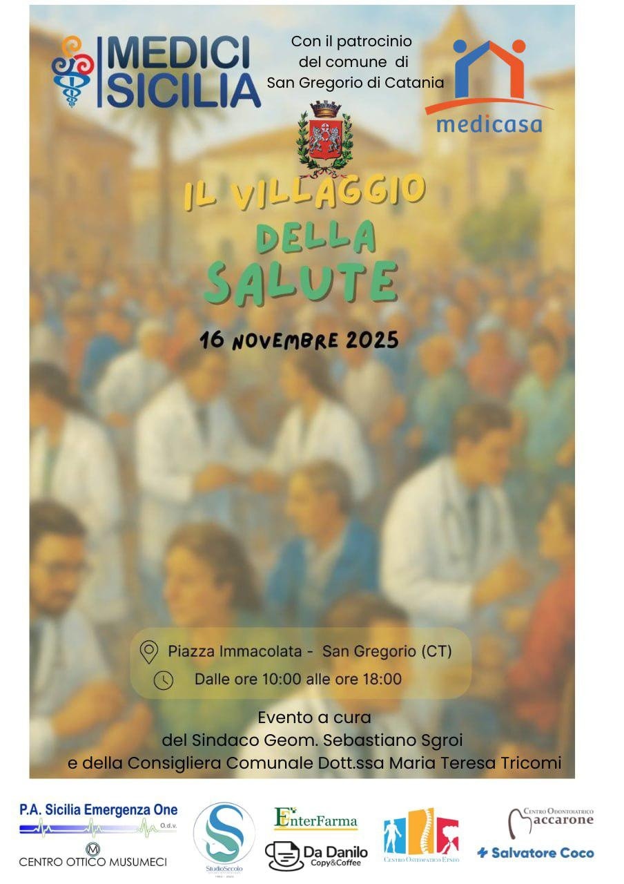 Domenica 16 novembre, Piazza Immacolata a San Gregorio di Catania ospiterà il “Villaggio della Salute”, un'iniziativa dell'associazione Medici Sicilia, patrocinata dal Comune e promossa con impegno dalla consigliera Maria Teresa Tricomi.