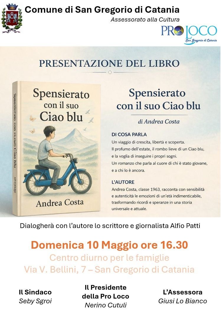 è lieta di invitare la cittadinanza alla presentazione del libro “Spensierato con il suo Ciao blu”del nostro concittadino Andrea Costa, sangregorese doc che vive da anni in Svizzera per lavoro, ma che ha custodito intatto il legame profondo con la sua comunità d’origine.